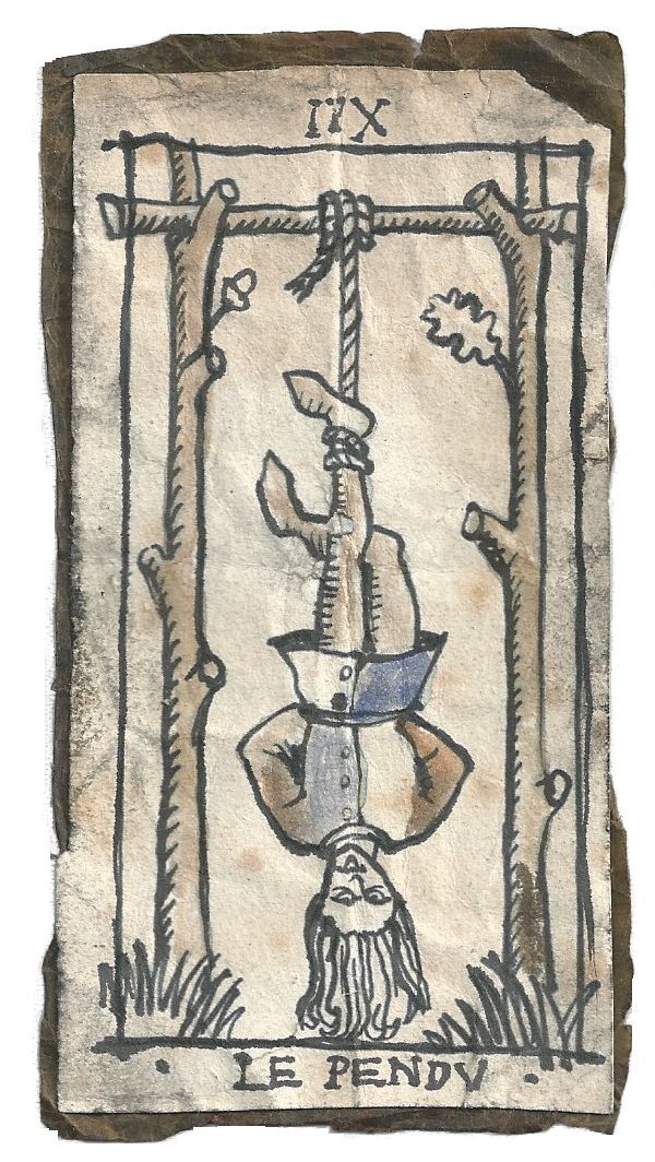 You will read a lot of bullshit about this card. This method of execution was popular in Italy and doubtless everywhere else in Europe back in the Quattrocento. It was reserved for traitors, a flexible term given the whole city state thing. The individual thus strung up was allowed as much food and water as he wanted. He is also suspended by one foot, not two. All the tarot interpretations say that this is something to do with wisdom, ha ha! This is a classic example of the decay of knowledge. The original tarot had nothing to do with nonsense and everything to do with gambling. I assume that the nature of chance led to the not unreasonable belief in cards being able to foretell the future. My conclusion is that while cheating at cards is disgraceful and wrong, using them to peek into the hand that fate holds is disgraceful and wrong as well. Regardless of what anyone says, this is a death card and a prognosticator of disaster.