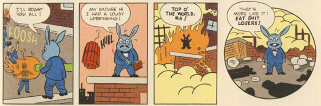 Biker Bunny, Fritz the Cat. Speed freak and revolutionary, this movie is so fucked up as to take all of Crumb's considerable charm out of his creations. Still, he got 9 million dollars for doing nothing and all he does is bitch about it. I bet Ralph Bakshi is pretty cool to hang out with unlike Robert Crumb.